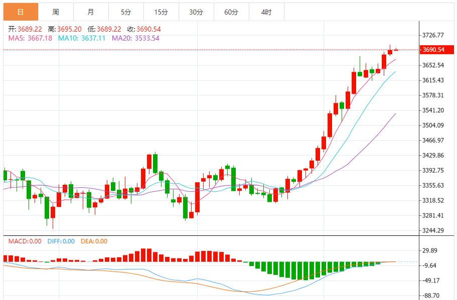 周三(9月17日),现货黄金目前位于3690.32美元/盎司附近,涨幅为0.02%。