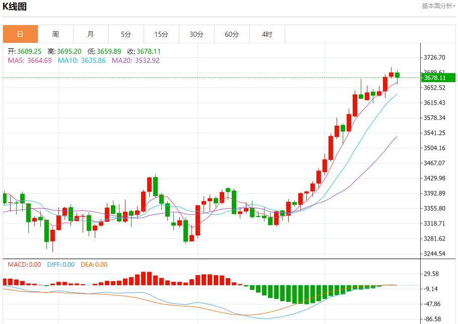周三盘中,现货黄金报3678.11,跌幅0.31%。