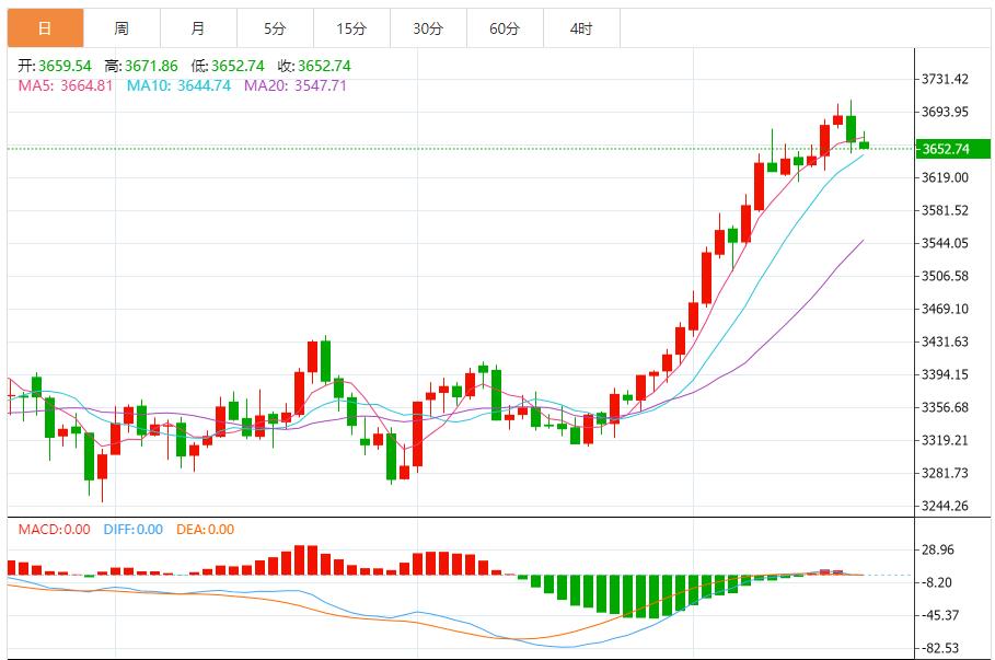 在这一上升通道中,价格回调往往在通道下轨附近获得支撑后再度上行。目前,中期上升通道下轨位于3400美元/盎司左右,距离当前价格仍有一定空间。从MACD指标的中期表现来看,DIF线和DEA线均在零轴上方,且DIF线位于DEA线之上,MACD柱状线持续为正且处于较高水平,显示中期上涨趋势依然强劲。