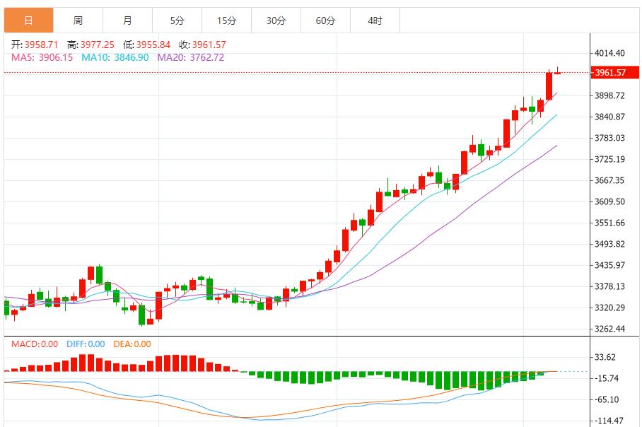 黄金市场昨日延续拉升趋势,早盘小幅高开在3888.8的位置后行情先回落给出3883.8的位置后行情强势震荡拉升,破位3900整数关口后行情强势拉升,日线最高触及到了3970.1的位置后行情尾盘整理,日线最终收线在了3961.1的位置后行情以一根上影线稍长于下影线的大阳线收线,而这样的形态收尾后,今日的行情有冲击4000整数关口的预期,点位上,今日早盘回落的话3946多保守3943多止损3939,目标看3965和3971.破位看3976和3982和3993和4000压力关口争夺。