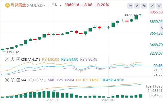 10月7日,黄金继续历史性攀升,周二在3,977美元附近再创历史新高。黄金的上涨反映出市场焦虑加剧,因为在美国政府长期关门以及美联储进一步降息的预期不断升温的情况下,投资者寻求避险资产的避难所。