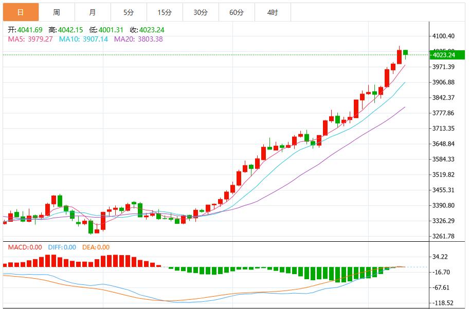 周四(北京时间10月9日)亚市早盘,现货黄金交投于4020美元/盎司附近,现货黄金周伞首次突破每盎司4000美元大关,延续破纪录涨势至4059.07美元/盎司。地缘政治与经济不确定性加剧,以及市场对美国降息的预期,促使投资者涌入避险资产。