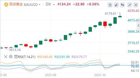 10月14日,黄金在周二亚洲时段延续了近期创纪录的涨势,在基本面支撑的背景下,黄金似乎有望进一步攀升。在美国政府关门导致经济不确定性的背景下,中美贸易紧张局势的重新加剧继续推动避险资金流向金条。此外,地缘政治风险和对美联储进一步降息的坚定预期被证明是有利于无收益黄金的其他因素。
