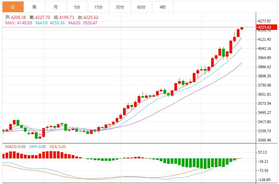 而且k线呈现圆弧底的形态,就是螺旋式的上移,k线继续企稳均线上方,所以操作上继续保持一路高歌的节奏,下方支撑位置先关注日内回踩低点4165附近,此位置不破再次刷新高点也不是没有可能,上方我们还是保持上不猜顶原则,操作上主多辅空操作。今日亚盘短线操作上下方回落给出4180多止损4170,上方目标看4200-4210;上行至4230可短空止损4240,下方目标看4210-4200。