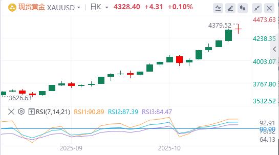 10月17日,黄金在历史高点附近坚持看涨倾向,并有望连续第九周强劲上涨。由于中美贸易紧张局势再度加剧、地缘政治不确定性持续存在以及美国政府长期关门导致的经济风险担忧,全球情绪受到打击。这从股市普遍疲软的基调中可以明显看出,并成为避险贵金属的推动力。