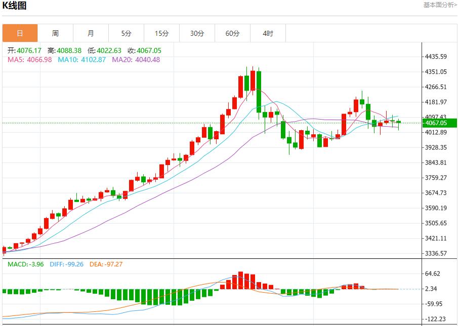 周五盘中,现货黄金报4065.32,跌幅0.29%。
