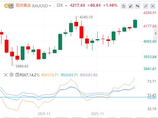 下行方面,4,125美元构成首个支撑位,随后依次是4,085美元(20日SMA)、4,030美元(50日SMA)和3,970美元(38.2%斐波那契回撤位)。上行方面,阻力位可能出现在4,245美元(11月13日高点)、4,300美元(整数关口)和4,380美元(上涨趋势终点)处。