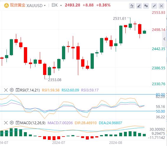 8月23日,周五欧市easymarketscn.COm盘中,黄金功扭转下跌趋势,从隔夜的损失中恢复过来,升至约2493.35美元,盘中最高为2495.81美元。这种反弹很大程度上归因于美元疲软,因为对鸽派美联储(Fed)的预期促使一些美元抛售。持续的地缘政治紧张局势也为黄金提供了额外的支撑。