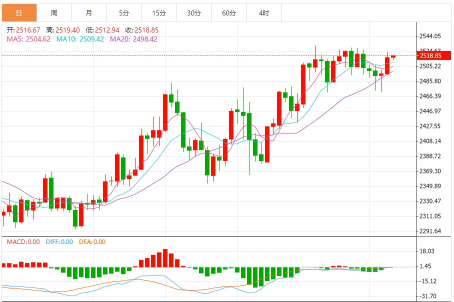 周四,因疲软的美国ADP就业数据打击美元,现货黄金收盘大涨21.36美元,涨幅0.86%,报2516.58美元/盎司;金价盘中最高触及2523.54美元/盎司。