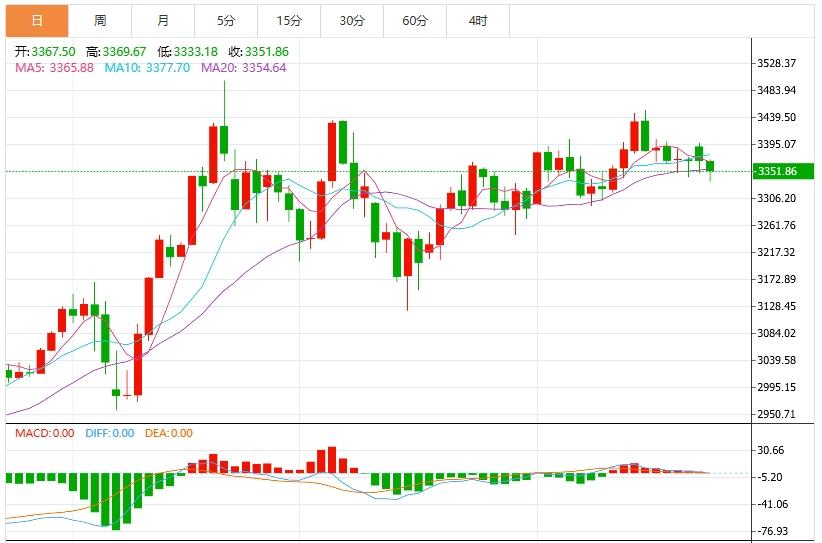 从日线K线图来看,黄金价格整体处于布林带中轨附近震荡运行,当前布林带三轨呈水平运行状态,显示市场短期趋势尚不明确。K线走势上,近期多次收出实体较小的阳线与阴线交替组合,显示出典型的横盘整理格局,同时形成明显的震荡区间(3300-3450美元)。MACD指标显示,目前主线与信号线较为接近,柱状图虽仍位于零轴下方,但有试图走出底背离之意。分析认为若能向上穿越并转为红柱,将为多头释放进一步动能信号。
