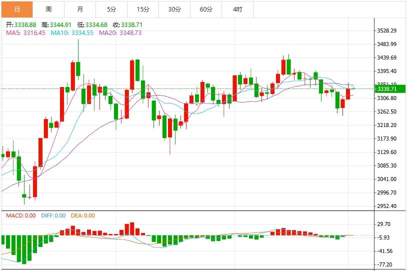 从日线图观察,黄金目前运行于典型的布林带区间之内,布林中轨位于3344美元,当前价格交投于该中轨附近,显示多空交投尚未打破均衡状态。布林带上轨和下轨分别位于3420美元与3268美元,形成明显的上下边界限制。近期价格多次在3250美元附近获得支撑,构成一个稳定的箱体底部区域,而上方则在3400美元附近受阻,反复测试未能有效突破。分析认为这一3250-3400美元的宽幅箱体整理格局提示,短期内黄金走势仍处于横盘趋势,尚待关键催化因素引发突破。